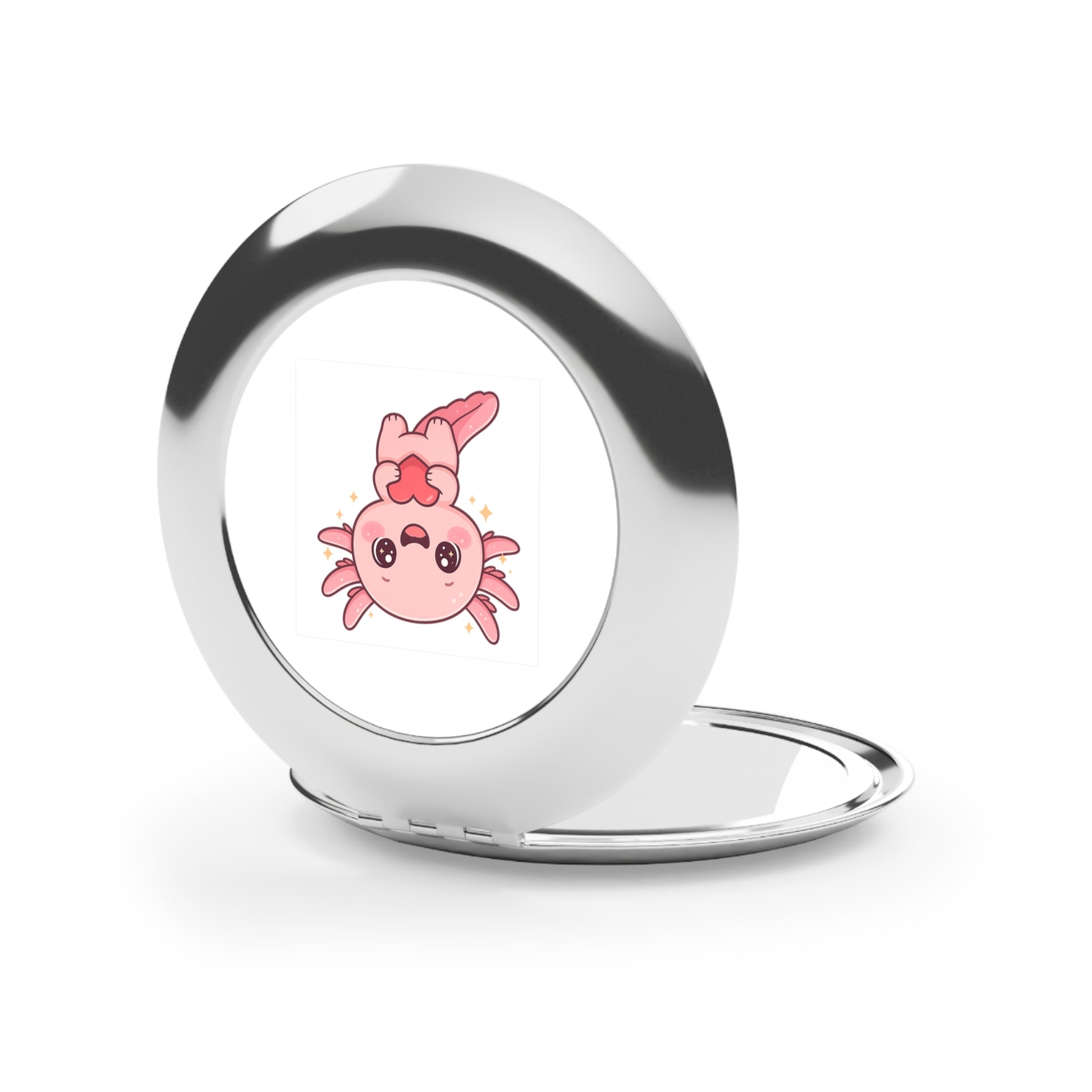 This personalized compact mirror is the perfect makeup gadget for touching up on the go. Made to be travel-friendly, cute, and shiny, it comes with a secure-snap friction closure, a sleek round shape and a metal finish for extra stylish points. Put your designs on the white metal insert and create the perfect travel makeup mirror.